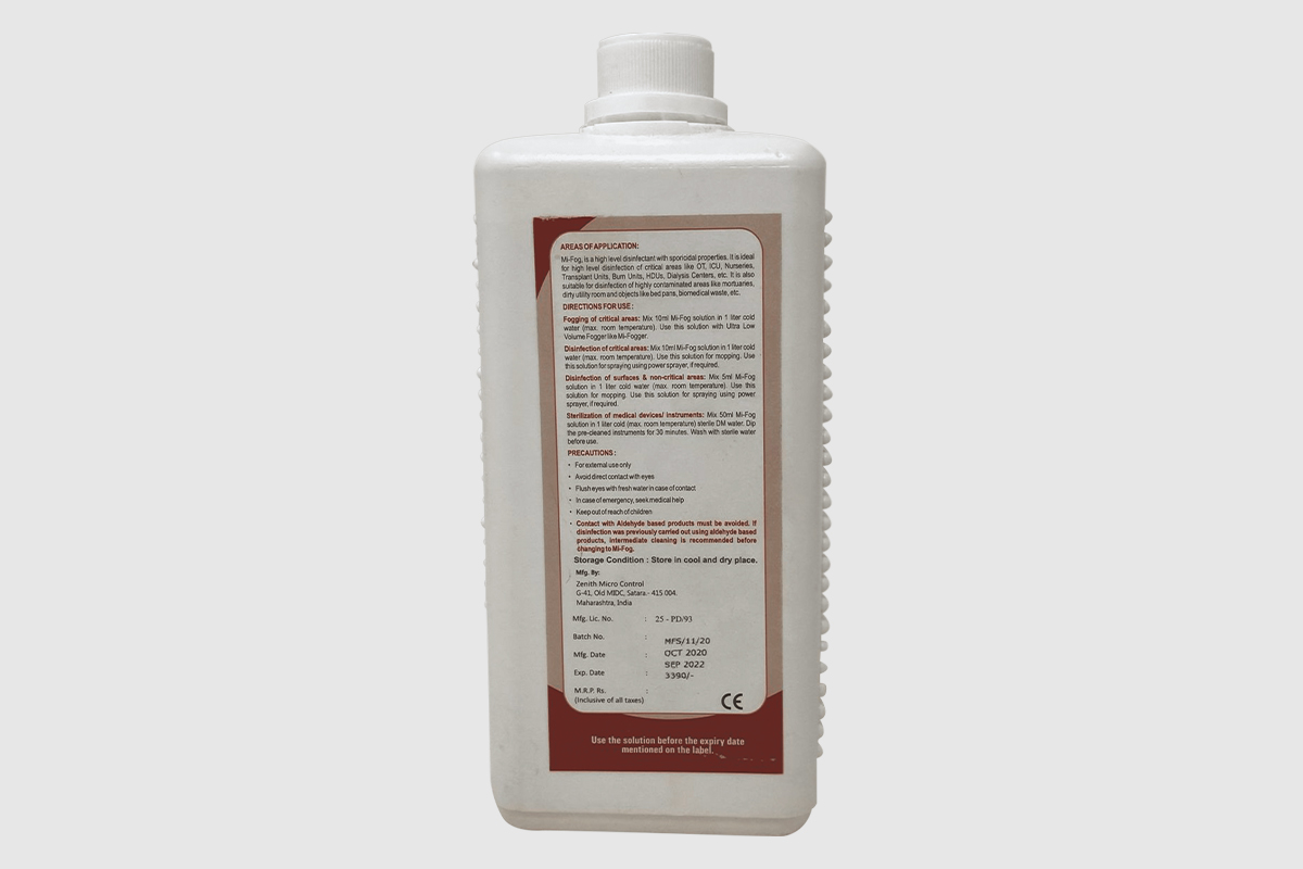For external use only.; Avoid direct contact with eyes.; Flush eyes with fresh water in case of contact.; In case of emergency, seek medical help.; Keep out of reach of children. Contact with Aldehyde based products must be avoided. If disinfection was previously carried out using aldehyde based products, intermediate cleaning is recommended before changing to Mi-Fog.